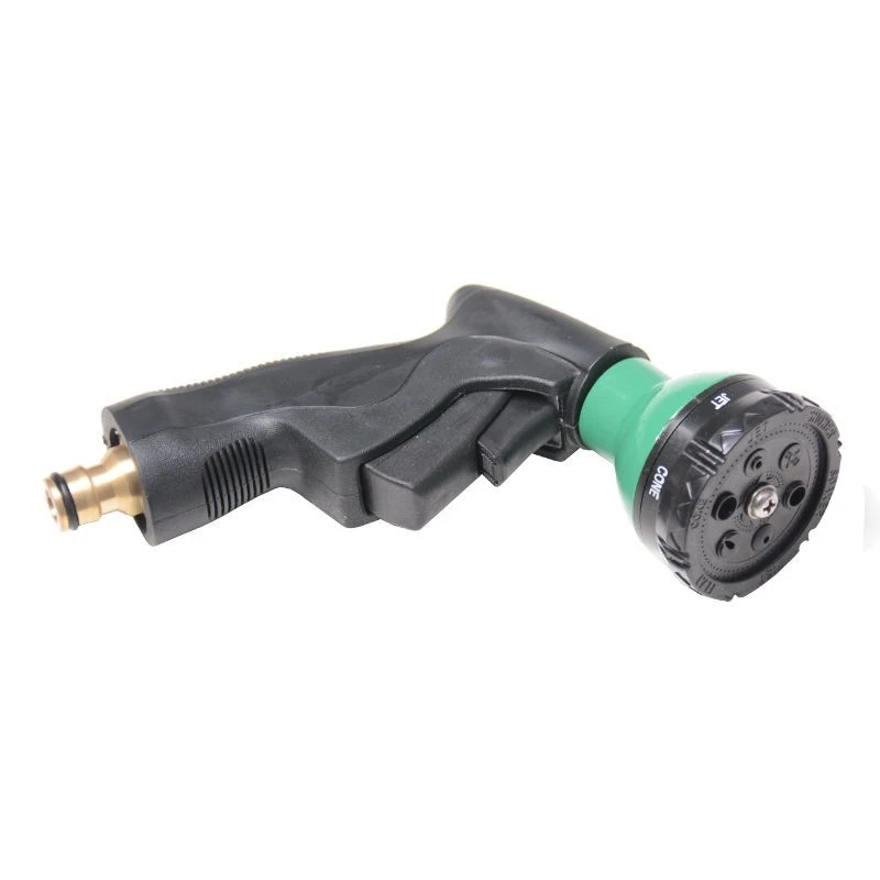 is een tuinsproeier met een draaibare kunststof kop met 6 verschillende sproeistanden (nevel, mist, straal, etc.) en rubber handvat.