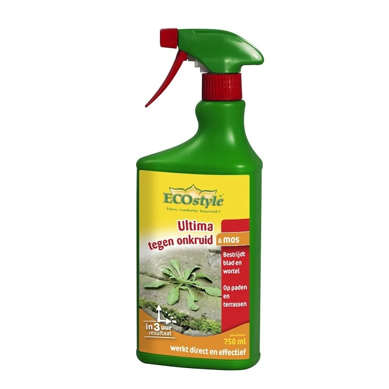 tegen onkruid en mos. Ecostyle Ultima onkruid en mos concentraat bestrijdt effectief alle onkruid en mos. Ecostyle Ultima in een praktische 4 liter can met direct te gebruiken vloeistof. Bijgeleverd is de handige spuitmond voor optimaal gebruiksgemak. Met de 4 liter can heeft u voor ca. 120 m2 voldoende voor een plaatsgewijze behandeling tegen onkruid en mos. Dit is uiteraard afhankelijk van de hoeveelheid en dichtheid van het onkruid! Ultima bestrijdt niet alleen het blad bovengronds, maar voorkomt ook de hergroei van het onkruid; direct en effectief. Kortom: snel en eenvoudig van uw onkruid af in de tuin. In 3 uur ziet u het eerste resultaat van uw behandeling.