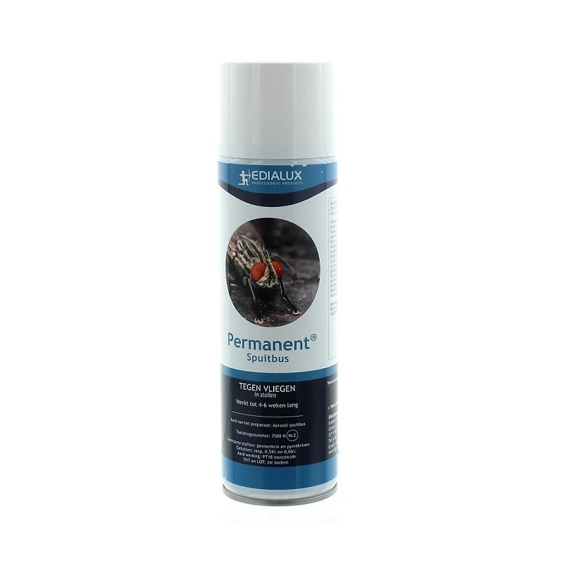 Lurectron Permanent Spuitbus is klaar voor gebruik. Dit middel tegen vliegen bevat 0,59% Permethrin en 0,06% Pyrethrum. Pyrethrum zorgt voor een snelle doding van de aanwezige vliegen. Permethrin heeft een snelle en langdurige werking (4 tot 6 weken).