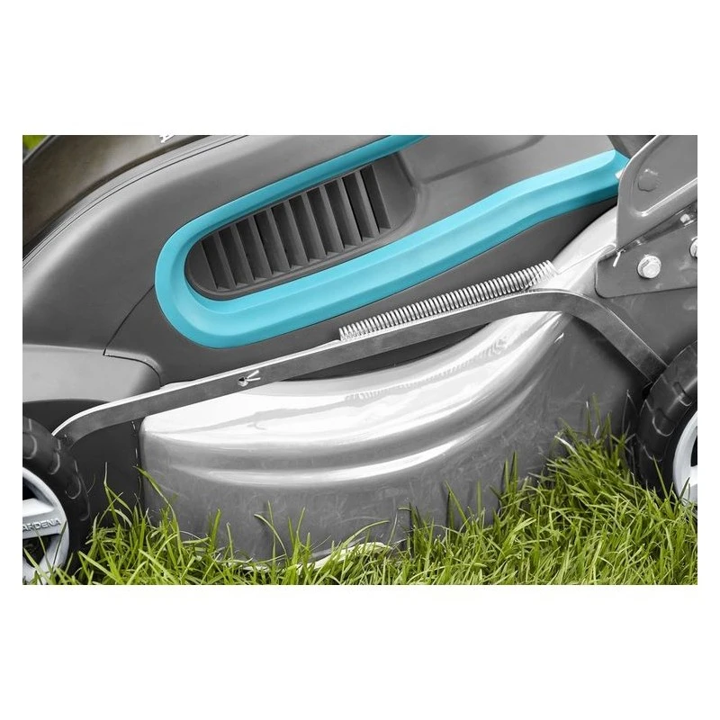 Extra graskam op de zijkanten van de behuizing om probleemloos tot aan de rand bij muren, bloembedden of gazonkanten te kunnen maaien.