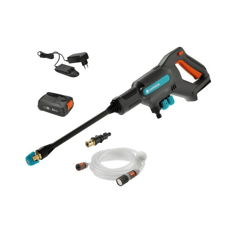De accu hogedrukreiniger Aquaclean 18V set is speciaal gemaakt voor u en alle andere trotse en gepassioneerde huis- en tuinbezitters. Deze mobiele, compacte en snoerloze medium drukreiniger wordt geleverd met diverse accessoires, zodat je direct aan de slag kunt. Een van de meest veelzijdige drukreinigers in zijn klasse met geïntegreerde LED-accustatus weergave in de machine en 3 vermogensstanden voor 9, 14 en 24 bar druk. Ideaal voor vele schoonmaakklussen. Auto’s, fietsen en vuilnisbakken zijn grondig en krachtig te reinigen met de 24 bar drukinstelling. Indien nodig kan de druk worden verlaagd tot 14 bar of nog verder naar de Soft-Clean-modus. De Soft-Clean-modus van 9 bar is bijzonder zacht, ideaal voor kwetsbare materialen en voorwerpen. Tegelijkertijd verlengt de verminderde druk de looptijd van de oplaadbare accu. De drukreiniger kan ongeveer 38, 20 of 16 minuten werken, afhankelijk van de gebruiksmodus. De nieuwe drukreiniger werkt met een nieuw 18V POWER FOR ALL accusysteem. De POWER FOR ALL ALLIANCE is een van de grootste merk overschrijdende accu allianties van toonaangevende fabrikanten wereldwijd en biedt de grootste verscheidenheid aan toepassingen voor uw huis en tuin. Door de lange accu looptijd kunt u grondige en ononderbroken reinigen. De oplaadbare accu in de kant-en-klare set, is ook geschikt voor andere compatibele apparaten in de POWER FOR ALL ALLIANCE. De accu is snel opgeladen met een capaciteit van 18V en 2,5 Ah. De set bevat drie verschillende spuitmondstukken voor verschillende spuitrichtingen, 0°, 15° of 40°. Elk spuitmondstuk is 360° draaibaar ten opzichte van de lans voor meer flexibiliteit bij het reinigen. De 0° puntsproeier is ideaal voor krachtige reiniging in kleine hoekjes en gaatjes. Afhankelijk van uw vereisten is de AquaClean ook compatibel met de GARDENA vuilfrees. Een 5 m lange aanzuigslang met filter, vlotter en klem is bij de set inbegrepen. Via een OGS kraanaansluiting kan de watertoevoer op de drukreiniger worden aangesloten. Ondanks dat hij niet is aangesloten op het elektriciteitsnet, is de moderne AquaClean zo krachtig dat hij water kan aanzuigen tot een diepte van 2 m dankzij de automatische aanzuigfunctie met een debiet van 250 liter per uur. Of u nu uw auto, fiets, terras, rolluiken of tuinmeubelen wilt schoonmaken – dankzij het intelligente ontwerp, de eenvoudige bediening en het lage gewicht van slechts 1,5 kg zonder accu blijft het werken met de drukreiniger zelfs voor een langere tijd comfortabel. De AquaClean 24/18V P4A kant-en-klare set bevat een korte en een lange sproeilans voor nog meer flexibiliteit en verbeterde ergonomie Met al deze elementen kunt u met deze instelbare drukreiniger uw tuin, fiets, auto of tuinmeubilair met weinig moeite en zonder omslachtige kabels in een handomdraai schoonmaken.