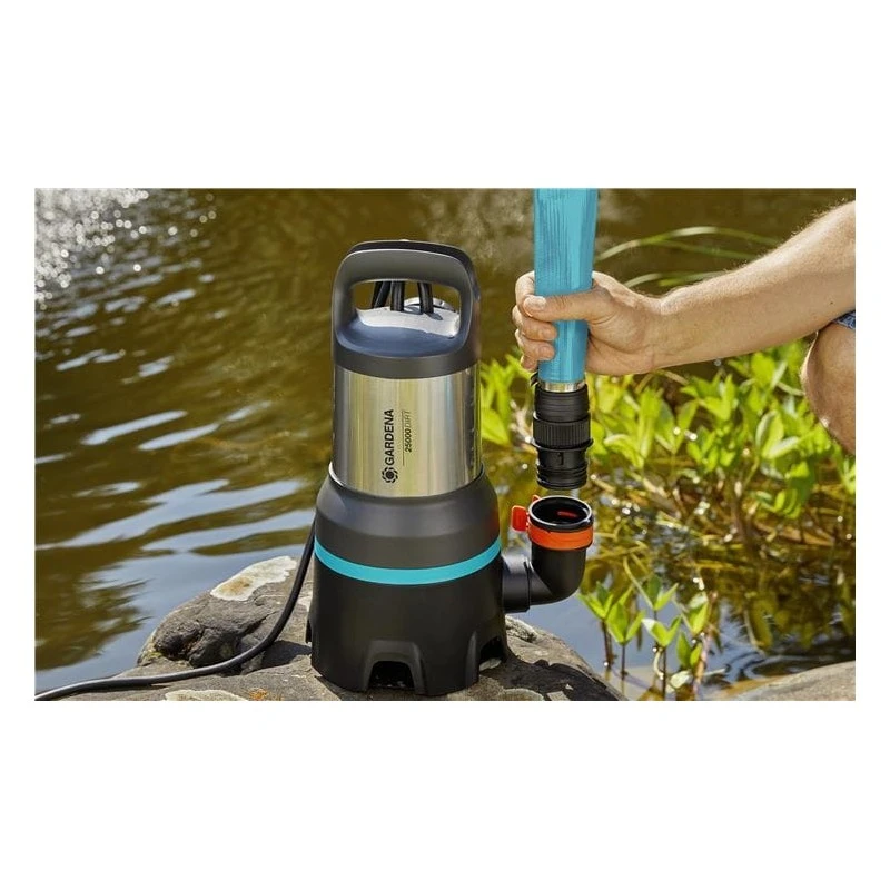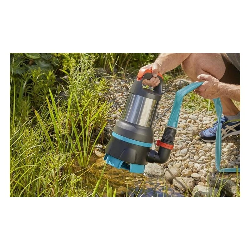 Of u nu uw tuinvijver wilt leegpompen en schoonmaken, een met regenwater gevulde bouwput wilt legen of uw kelder wilt schoonmaken na een overstroming of een leidingbreuk, met deze innovatieve combinatiepomp voelt u de kracht van GARDENA pompen en pompt u schoon en vuil water simpel weg. De motor heeft een vermogen van 860 W en een indrukwekkende pompcapaciteit van 19.500 liter water per uur. Met een druk van 1,0 bar en een maximale opvoerhoogte van 10 m is deze hybride pomp bijzonder efficiënt. De vlakke aanzuigkracht in de modus voor schoon water kan schoon of licht vervuild water tot 1 mm diep verwijderen, waarna een keldervloer gemakkelijk kan worden schoongeveegd. In geval van troebel water dat vuildeeltjes met een deeltjesgrootte tot 35 mm bevat, verandert u de 2-in-1 dompelpomp eenvoudig in een vuilwaterdompelpomp door de andere gebruiksmodus te kiezen. Dit is ideaal voor het droogmaken van een volgelopen bouwput met grove vuildeeltjes in het water en voor veel andere klussen waarbij vuil water moet worden weggepompt. Het is verrassend eenvoudig om te schakelen tussen de modi voor schoon en vuil water. Vuile handen en natte schoenen behoren absoluut tot het verleden. Dankzij het intelligente, slanke ontwerp en de hoogwaardige fabricage blijft de pomp voor vuil/schoon water 19500 Aquasensor van GARDENA altijd lekvrij en houdt uw handen en kleding altijd schoon en droog. Het keramische assysteem met lange levensduur heeft een drievoudige afdichting voor extra duurzaamheid. Een ander innovatief hoogtepunt van de pomp is het led-Aquasensor-systeem, dat op intelligente wijze het vereiste waterniveau handhaaft. De Aquasensor zorgt ervoor dat de combinatiepomp in smalle sleuven kan werken en biedt nauwkeurig instelbare in- en uitschakelhoogten. Het waterpeil wordt gemeten zonder direct contact met de sensor en wordt weergegeven met handige leds op het apparaat. Bovendien biedt de Aquasensor een intuïtieve aanraakbediening, bescherming tegen drooglopen en verstopping en handige tijdklokfuncties. Het nieuwe systeem is nog handiger dankzij de mogelijkheid om slangen met een eenvoudige klik aan te sluiten. Slangen met een diameter van 32 mm, 38 mm en 50 mm kunnen met één klik worden aangesloten. De optionele G1 ½”-schroefdraad zorgt voor nog meer aansluitmogelijkheden. Hierdoor is deze dompelpomp voor schoon/vuil water zeer indrukwekkend, niet alleen qua uiterlijk, maar vooral qua functionaliteit. Dit maakt de pomp ideaal voor alle veeleisende huis- en tuinbezitters.