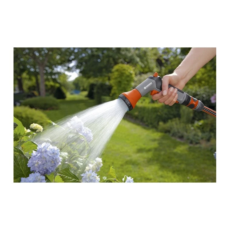 De gardena classic pistoolbroes kan vastgezet worden om comfortabel langdurig te besproeien.