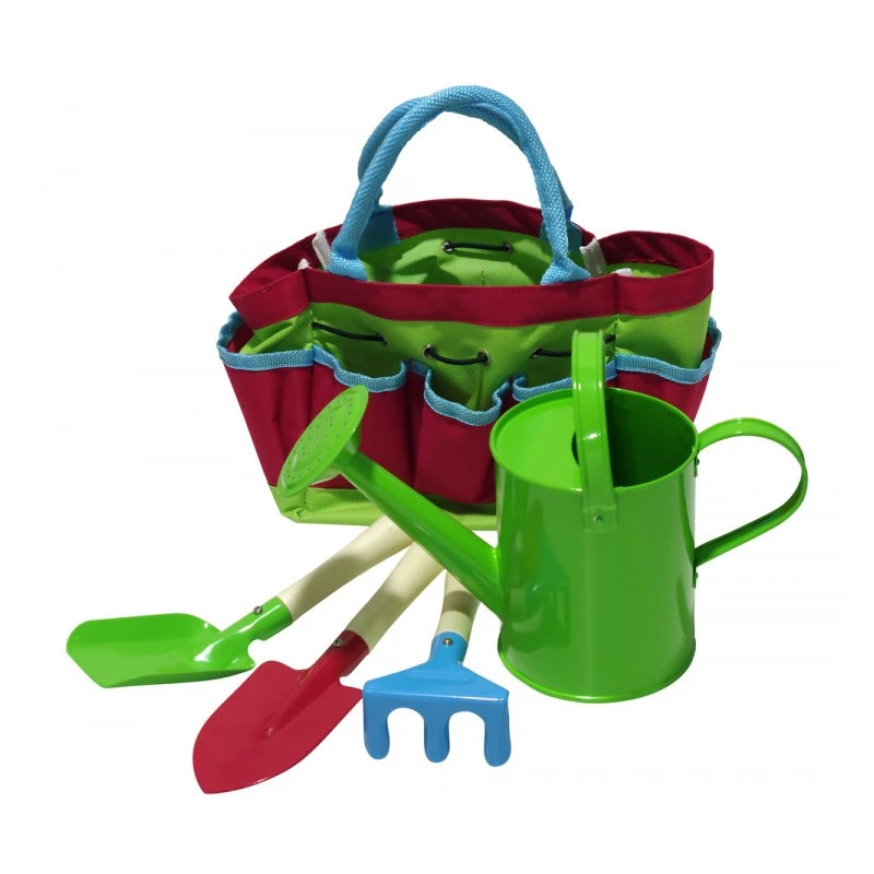 Het kinder tuingereedschap 5-Delig bestaat uit een gieter, schepje, schopje, harkje en een tas om het in te ruimen.