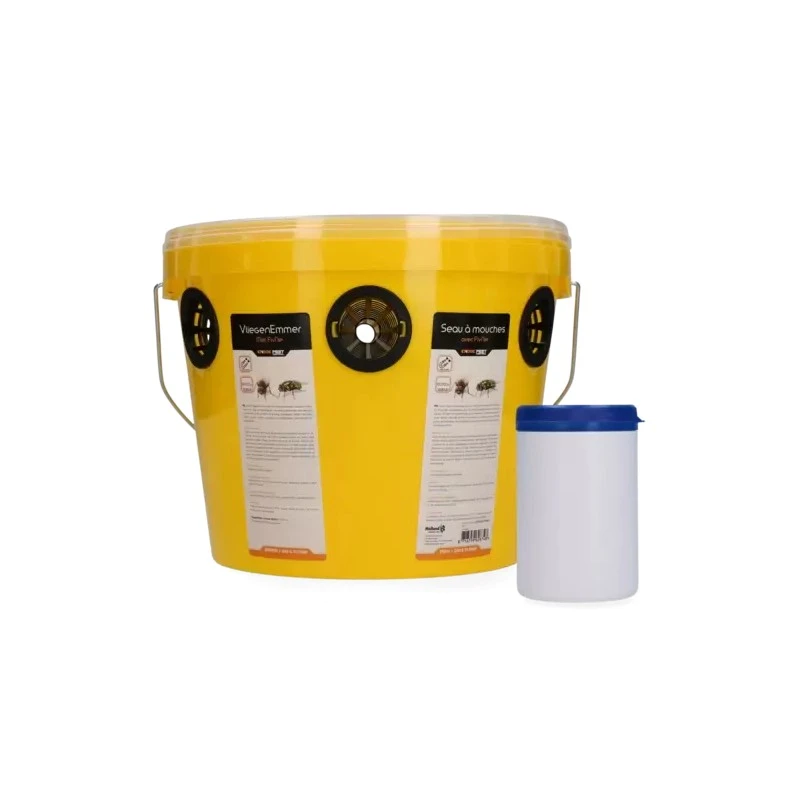 Plaats de 6 stuks ‘one way’ openingen op juiste wijze in de val. Vul de val met de bijgeleverde 240 gram lokstof en voeg 6 liter water toe. Monteer de deksel en plaats de val op 1,50 meter hoogte. Houd hierbij rekening met een afstand van 10-15 meter tot het object dat vliegenvrij moet blijven. De onderlinge afstand bij gebruik van meerdere vallen bedraagt 15 meter. Het is belangrijk dat de val in de zon en uit de wind staat (bijv. niet bij ventilatoren). De val is klaar voor gebruik! Wanneer de val vol zit met vliegen is het mogelijk m.b.v. een zeef de vliegen te verwijderen en eventueel weer water toe te voegen.